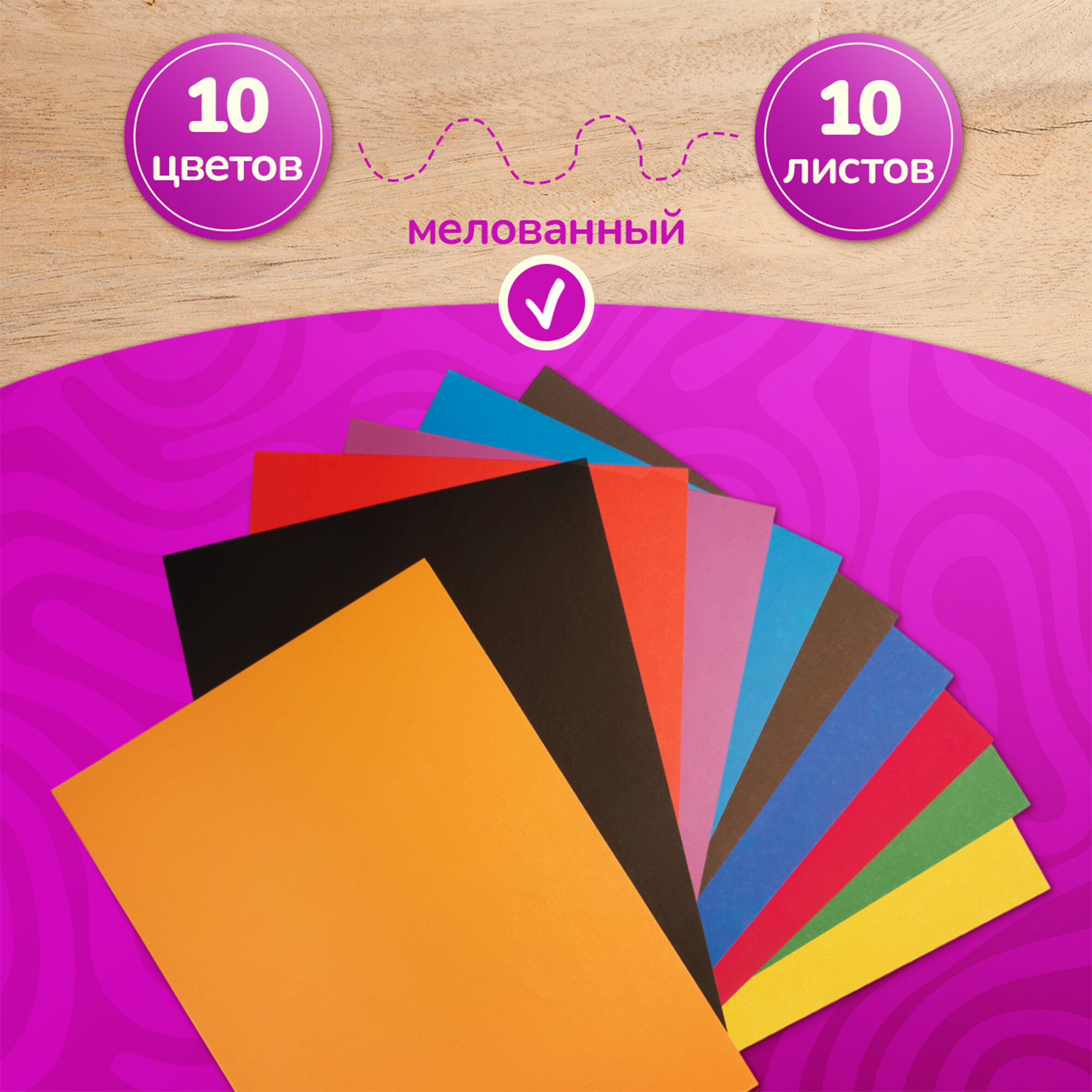 10 цен на Картон цветной А4 10 листов, 10 цветов двухсторонний мелованный для школы и творчества