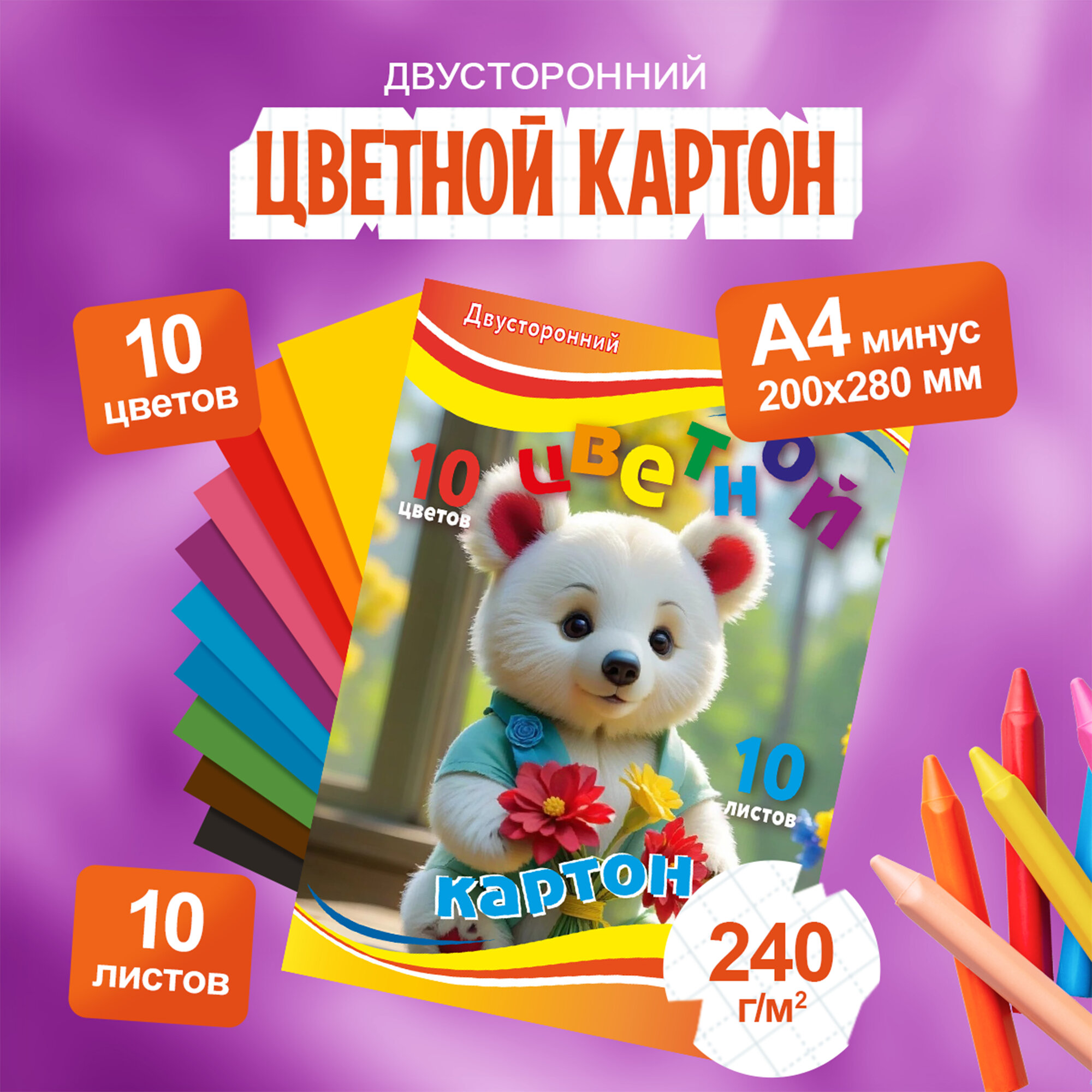 Картон цветной А4 10 листов, 10 цветов двухсторонний мелованный для школы и творчества информация: