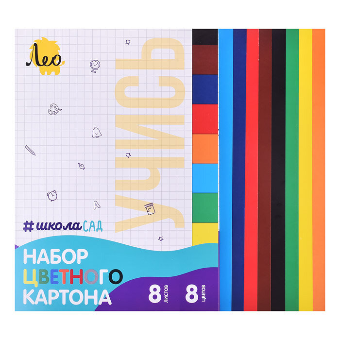 10 цен на "Лео" "ШколаСад" Набор цветного картона, мелованный LSCC-01 200 г/м2 A4- 20 х 28 см 8 л. 8 цв. .
