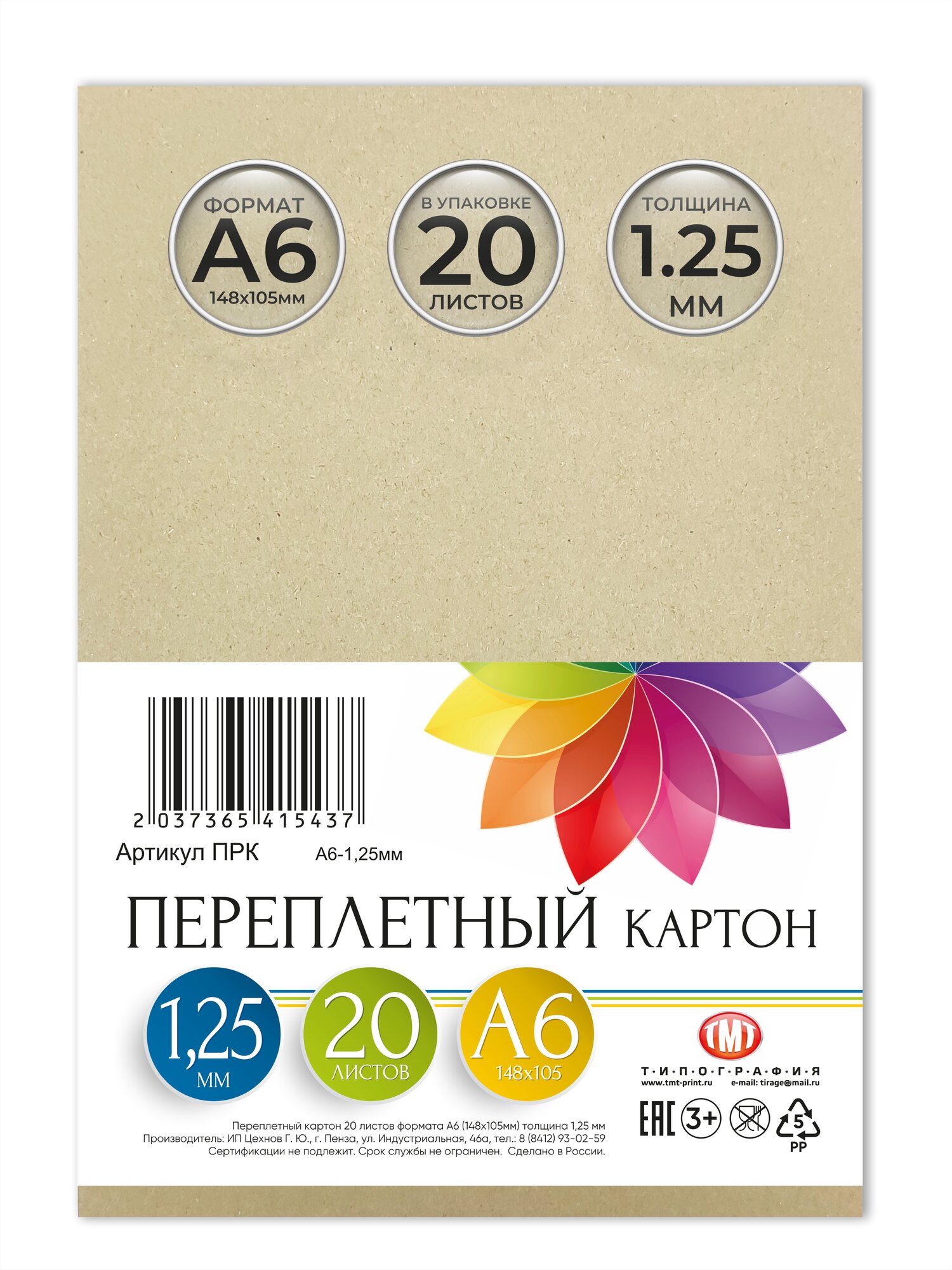 Переплетный картон от бренда Типография ТМТ 20 листов формат А6 толщина 1.25 мм информация: