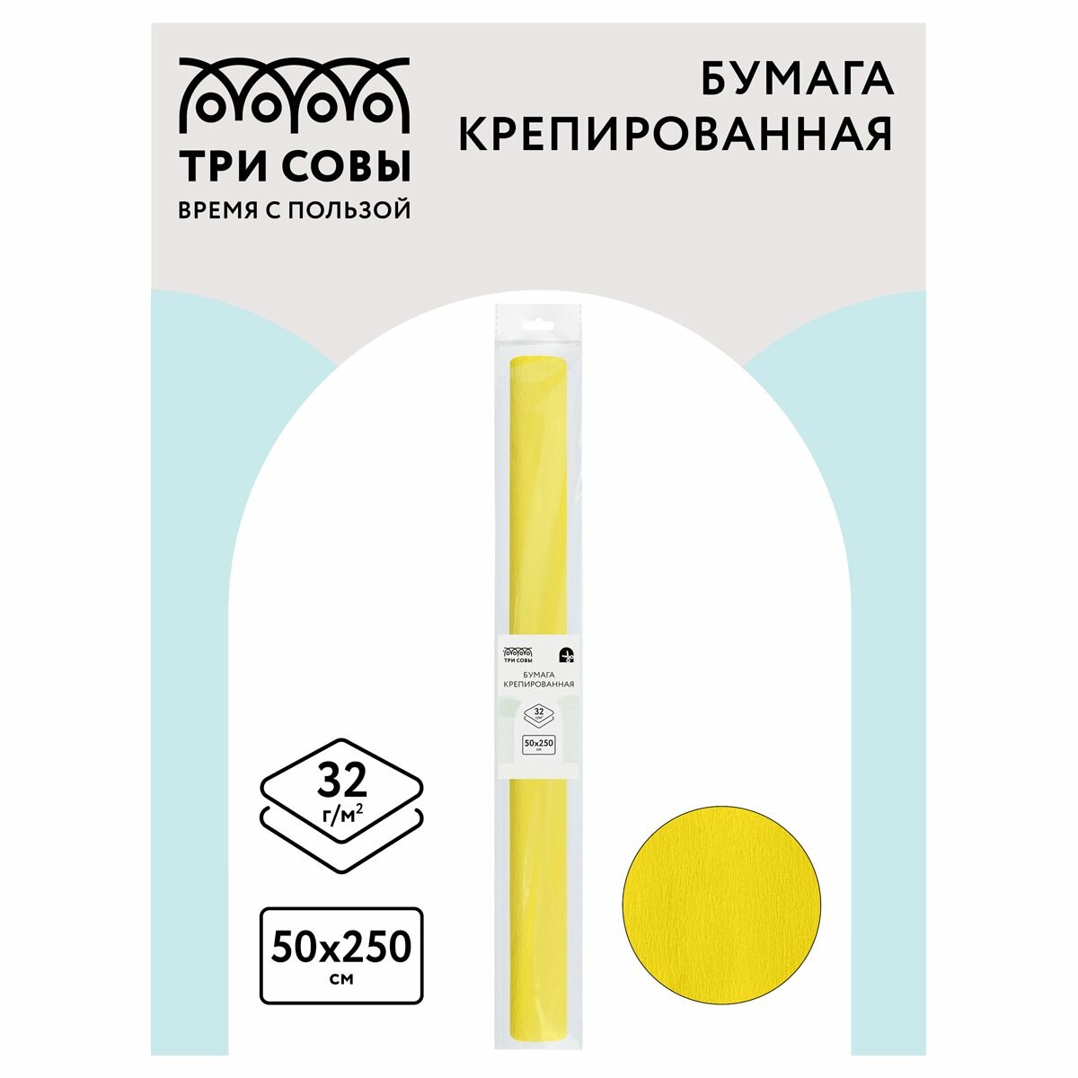 Бумага крепированная ТРИ совы, 50*250см, 32г/м2, желтая, в рулоне, пакет с европодвесом 334832 98 ₽