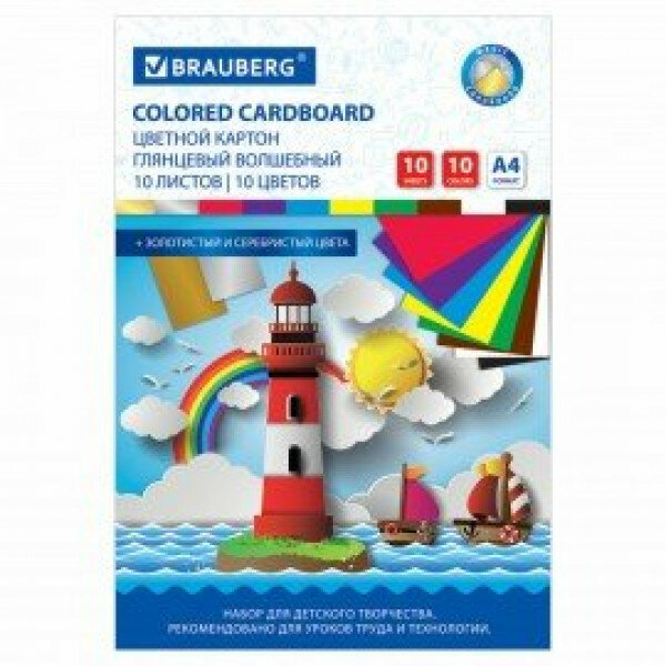 Картон цветной А4 мелованный (глянцевый), волшебный, 10 листов 10 цветов, в папке, BRAUBERG, 200х290 мм, "Маяк", 129915 информация: