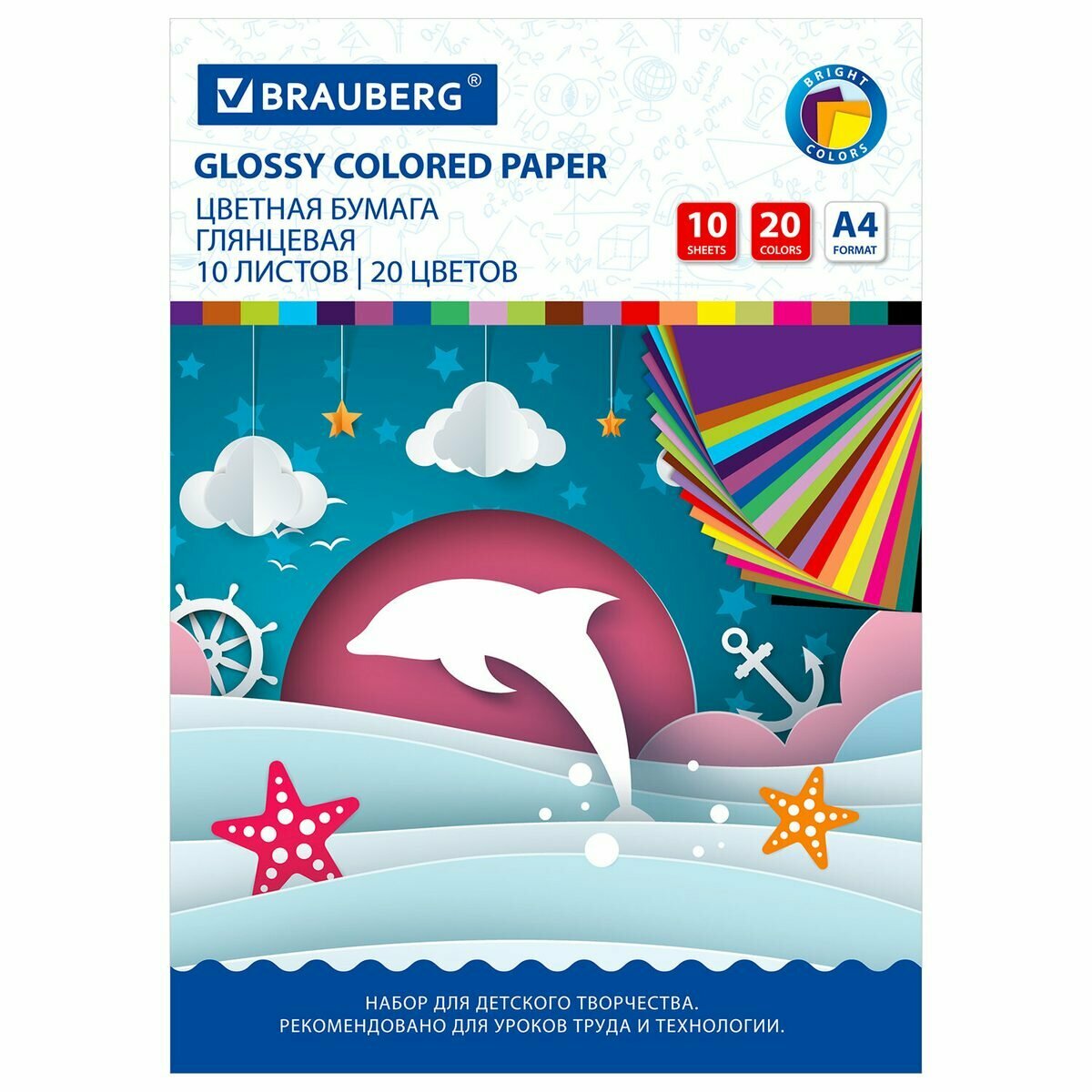 Бумага цветная двусторонняя мелованная Brauberg "Дельфин" (10 листов, 20 цветов, 200х280мм) в папке (129923), 70 уп. информация: