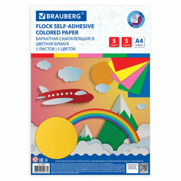Цветная бумага А4 бархатная самоклеящаяся, 5л, 5цв, BRAUBERG, 210х297мм, 124727 информация: