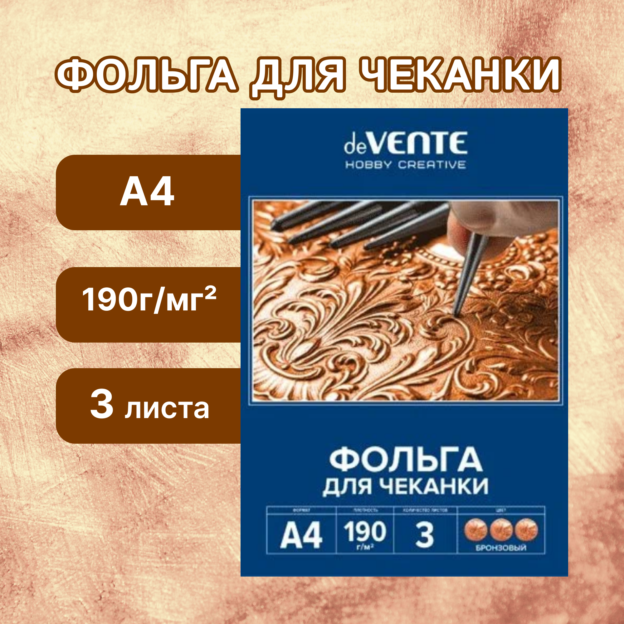 Фольга для чеканки A4 deVente 190 г/м, 3 л, в картонной папке, бронзовая информация: