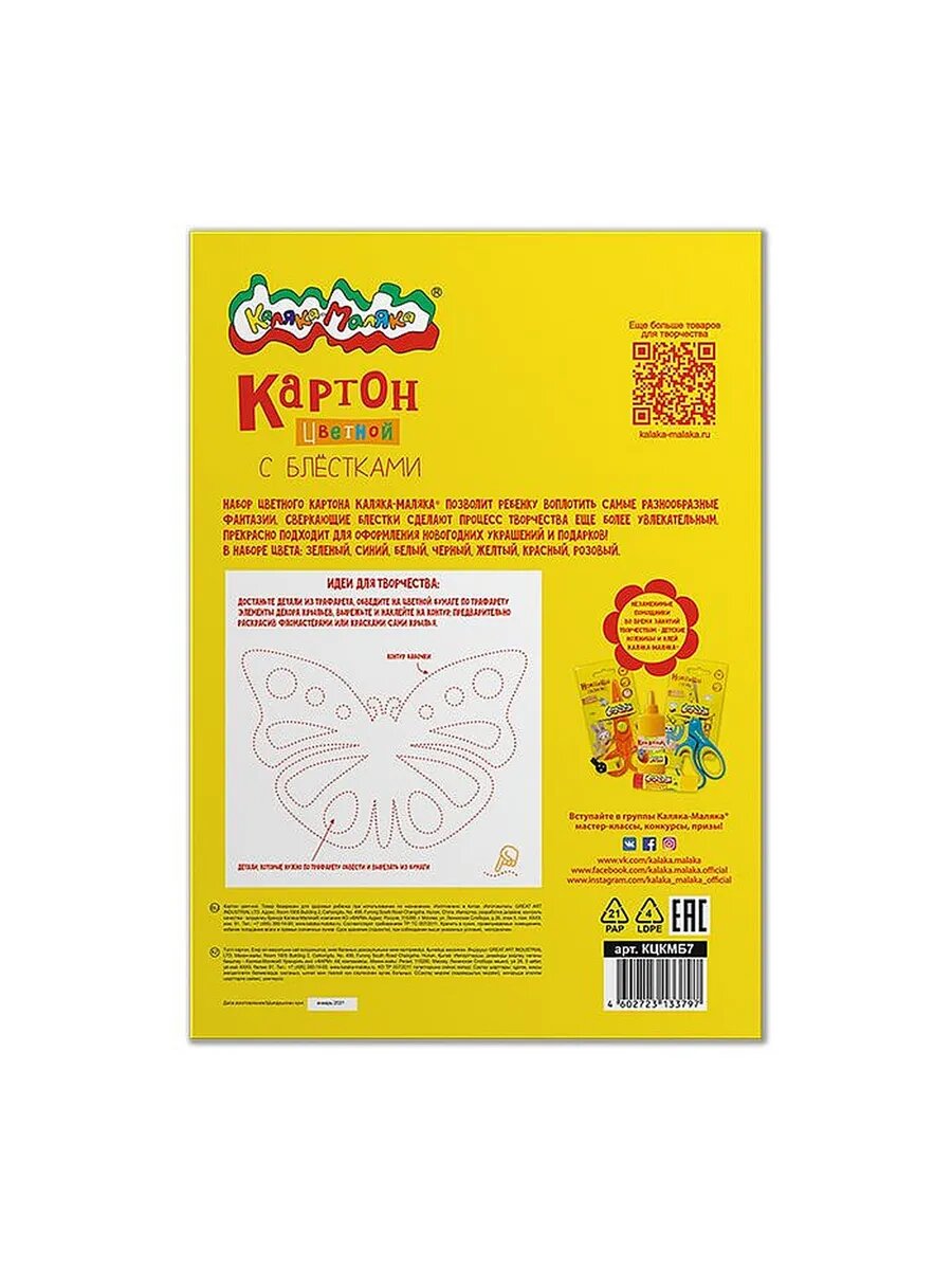 1шт Картон цв. Каляка-Маляка 7 цв. 7 л. мел. с блёстками с информация: