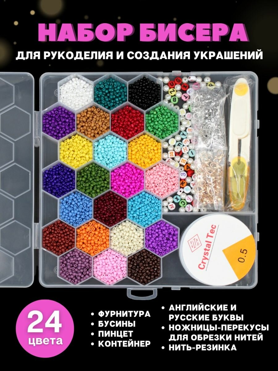 Большой набор 28 цветов бисера для плетения с силиконовой леской 0,8 мм и ножницами, размер органайзера 22,5 х 13,5 см BSD03/201288129