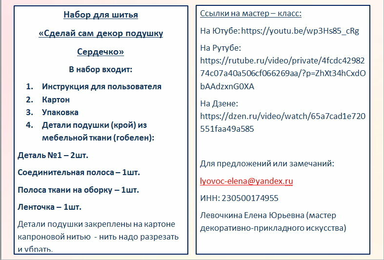 Набор для шитья "подушка Сердечко", гобелен, 38см х 43см Х 15см, сделать своими руками для декора дома и в подарок. информация: