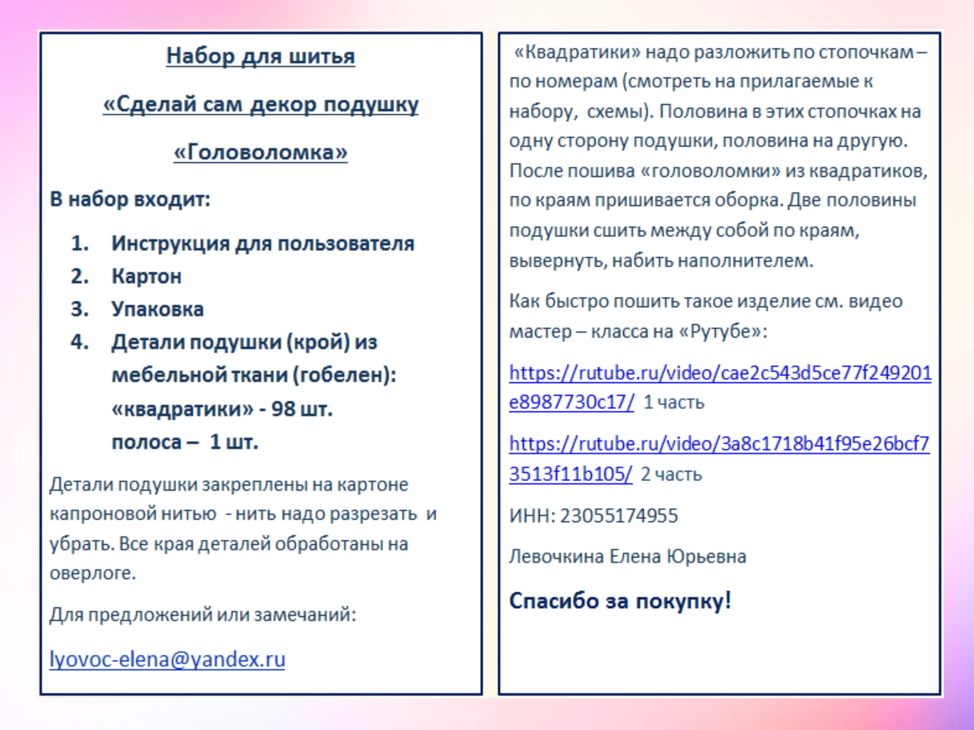 Набор для шитья "подушка Головоломка из квадратиков ткани 5х5" 6, размером 45см х 45см, гобелен и жаккард информация: