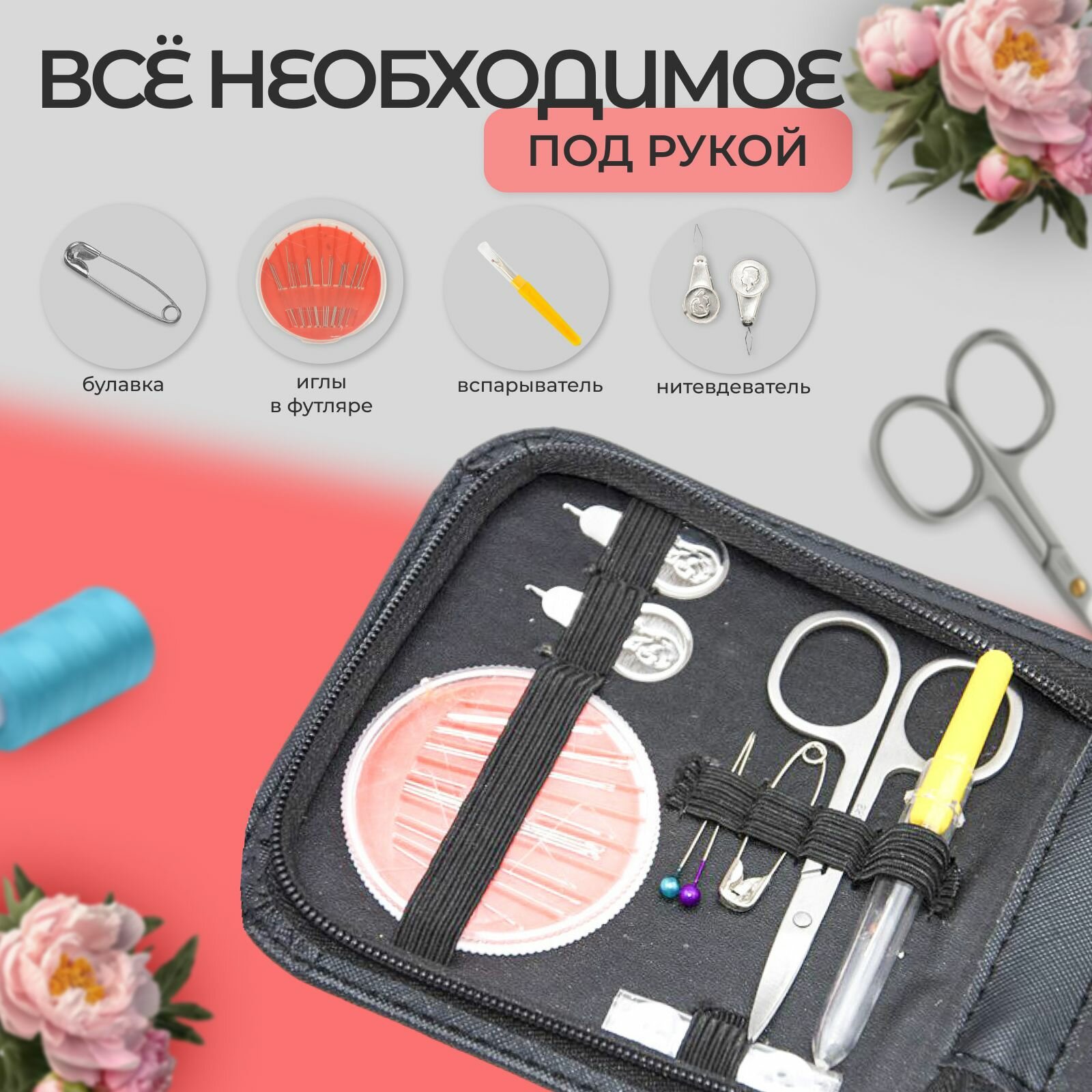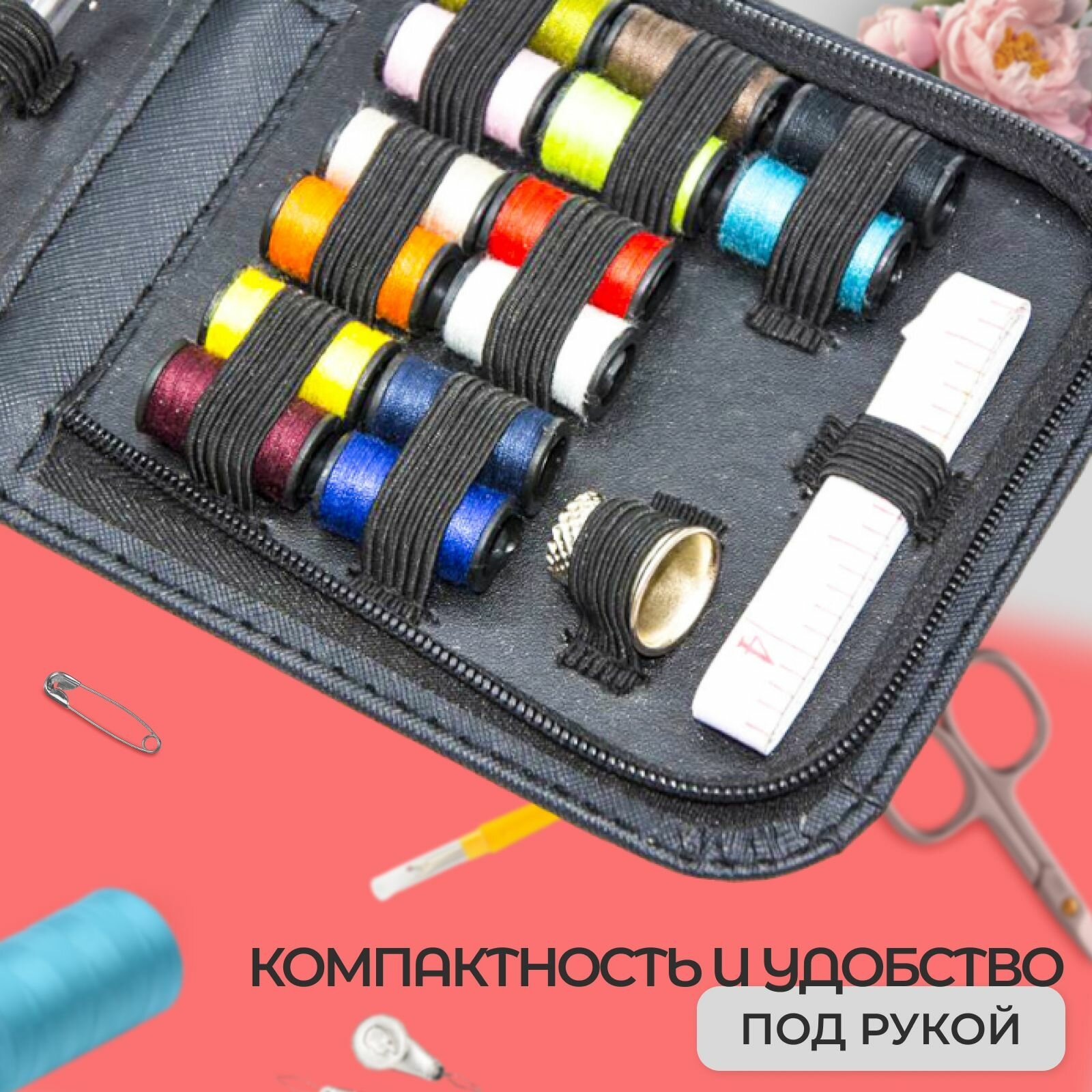 Отзывы на Компактный швейный набор 27 предметов, дорожный для ручного шитья и починки одежды с нитками и иголками, ножницами в кейсе органайзере Премиум-класса