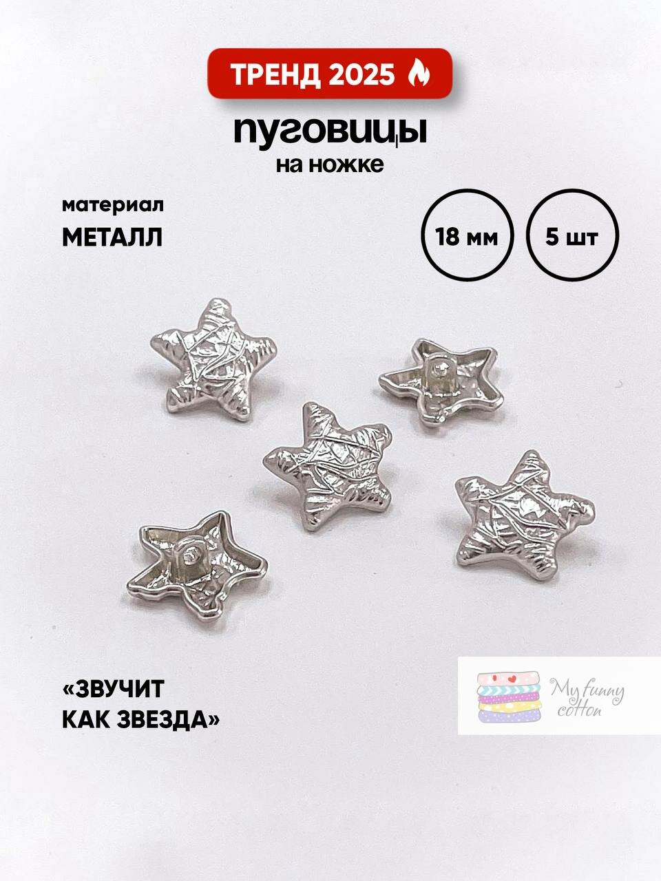 Набор пуговиц My Funny Cotton, декоративные, металлические, звезда, 18мм, 5шт, серебристые информация: