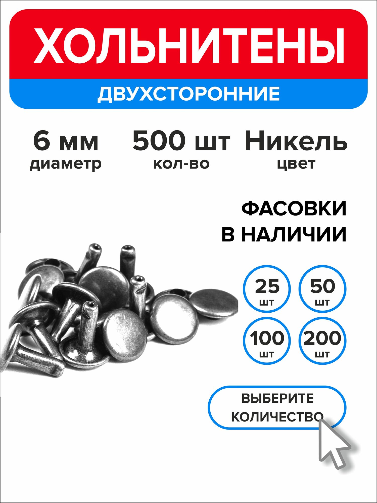 10 цен на Хольнитены двухсторонние 6 мм, заклепки, серебристый 500 штук