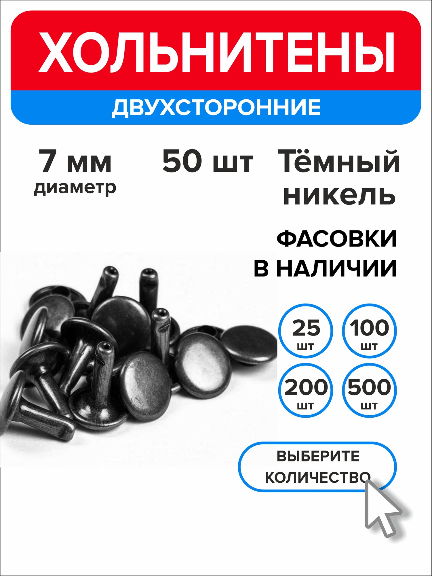 Мы выбрали 10 лучших цен на Хольнитены двухсторонние 7 мм, заклепки темный никель 50 штук. Перед тем как купить Хольнитены двухсторонние 7 мм, заклепки темный никель 50 штук посмотрите найденные предложения из Яндекс Маркета и других сайтов на основе XML фидов.