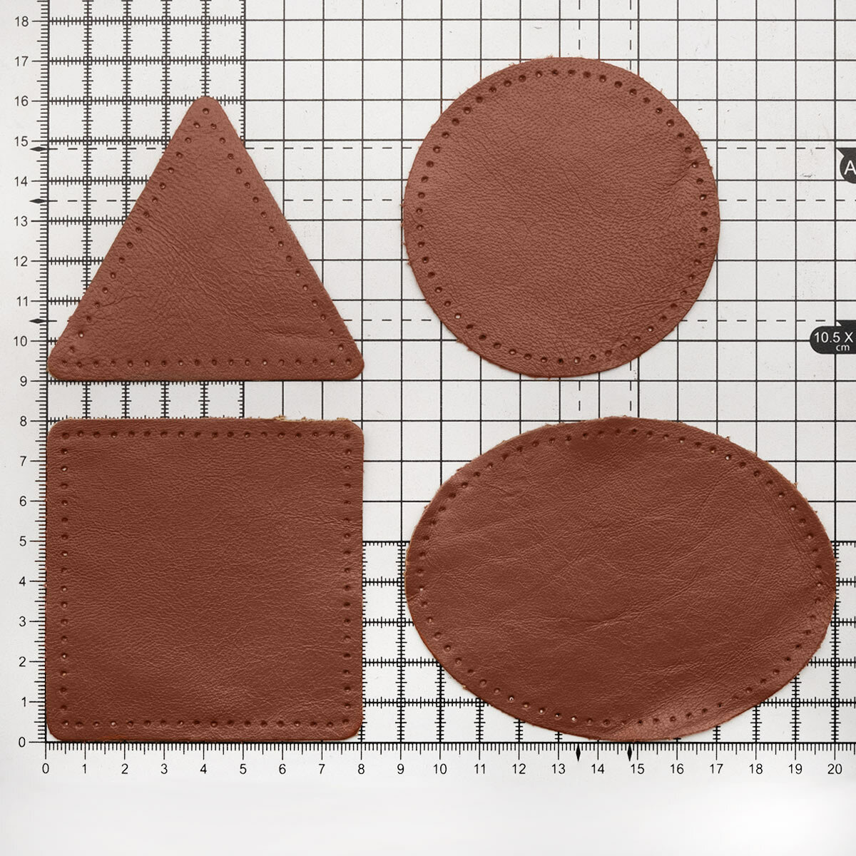 9743 Набор заплаток пришивных из кожи, круг, квадрат, треугольник, овал 8см, с перфорацией, 4шт/упак (02 светло-коричневый) информация: