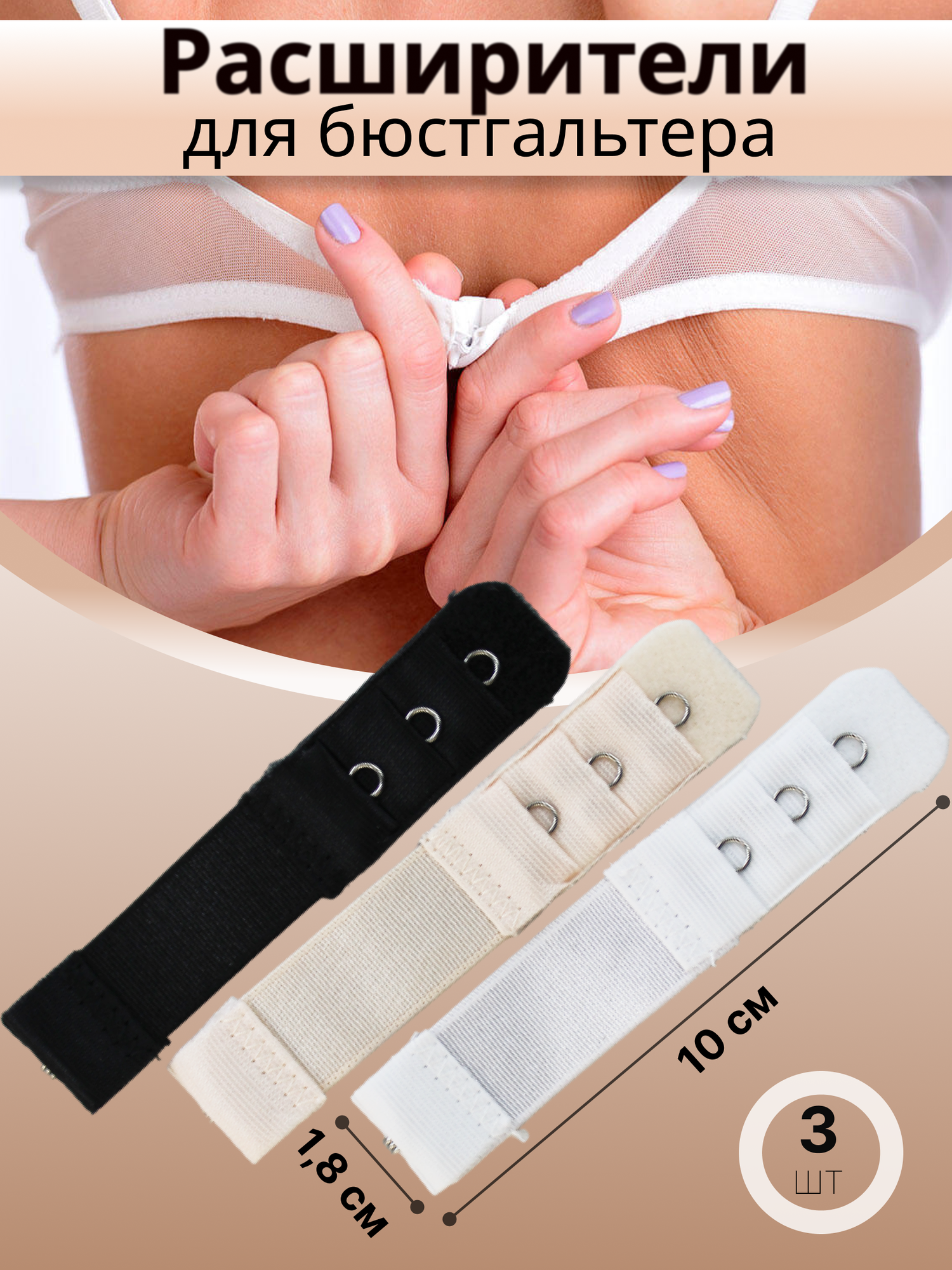 Удлинитель для бюстгальтера/ Расширитель для бюстгальтера/ 1 крючок, 3 ряда, 10 см/ комплект информация: