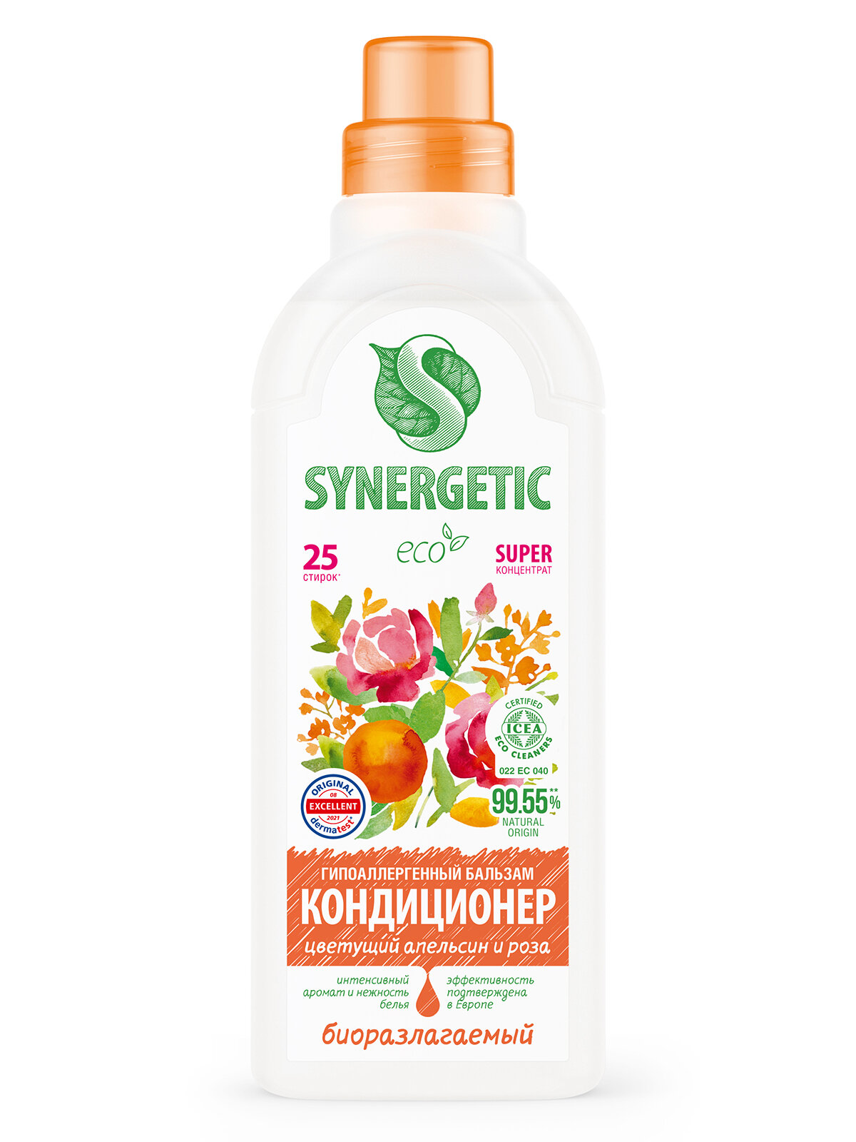 Кондиционер - ополаскиватель для стирки белья SYNERGETIC "Цветущий апельсин и роза" гипоаллергенный, концентрированный, 0,75л, 25 стирок информация: