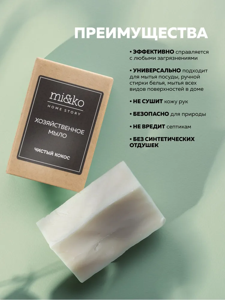 Мыло хозяйственное натуральное Mi&Ko "Чистый кокос" для дома и для стирки, 175 гр. информация: