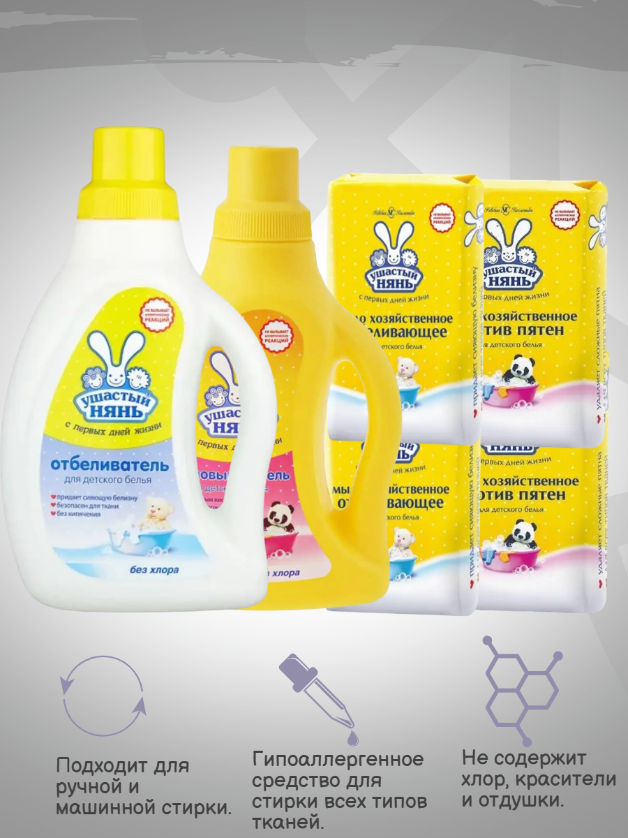 Пятновыводитель, Отбеливатель для детского белья, 750мл, Мыло хозяйственное против пятен, отбеливающее 4x180г информация: