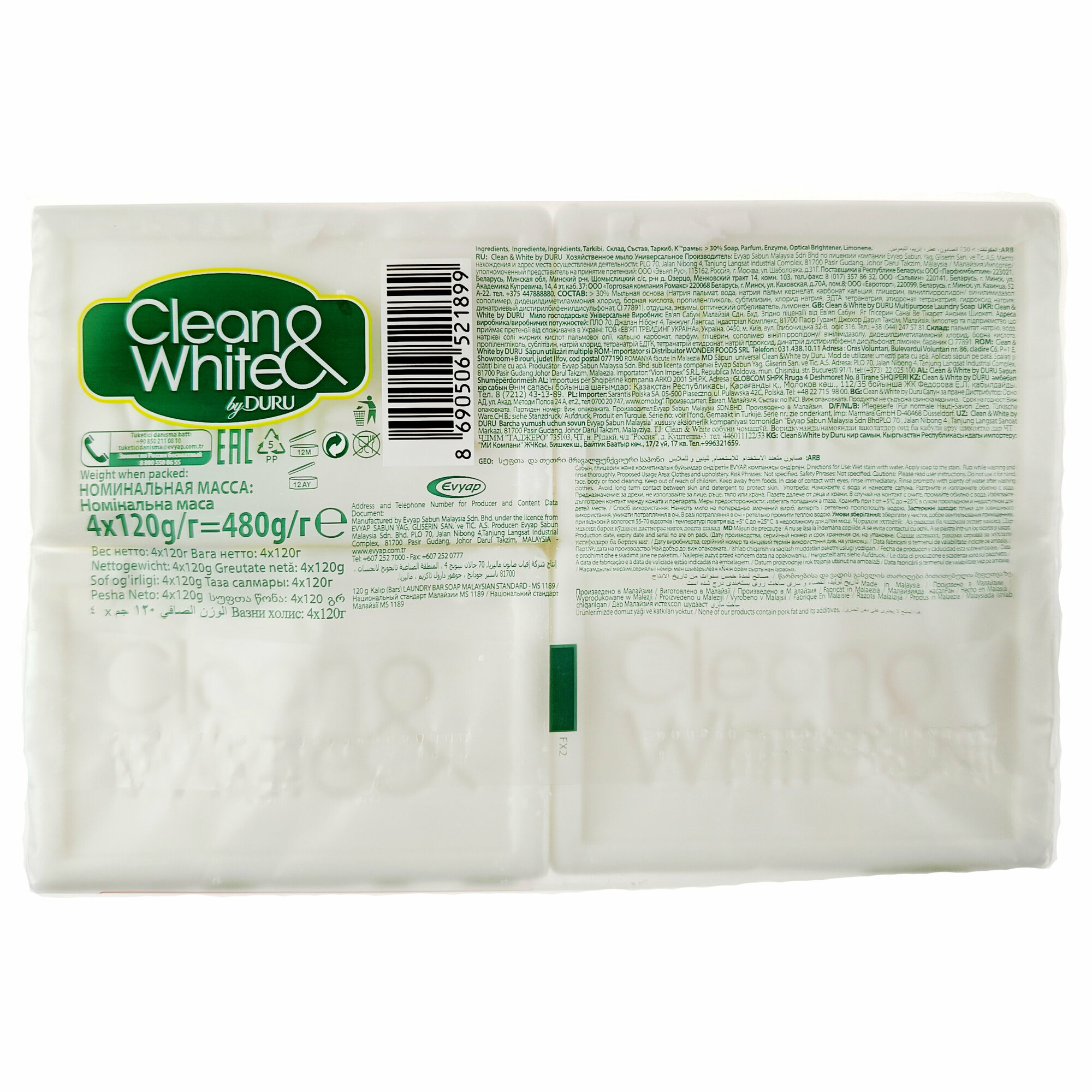 Мыло хозяйственного Duru Clean&White Универсальное, 4 шт по 120 г информация: