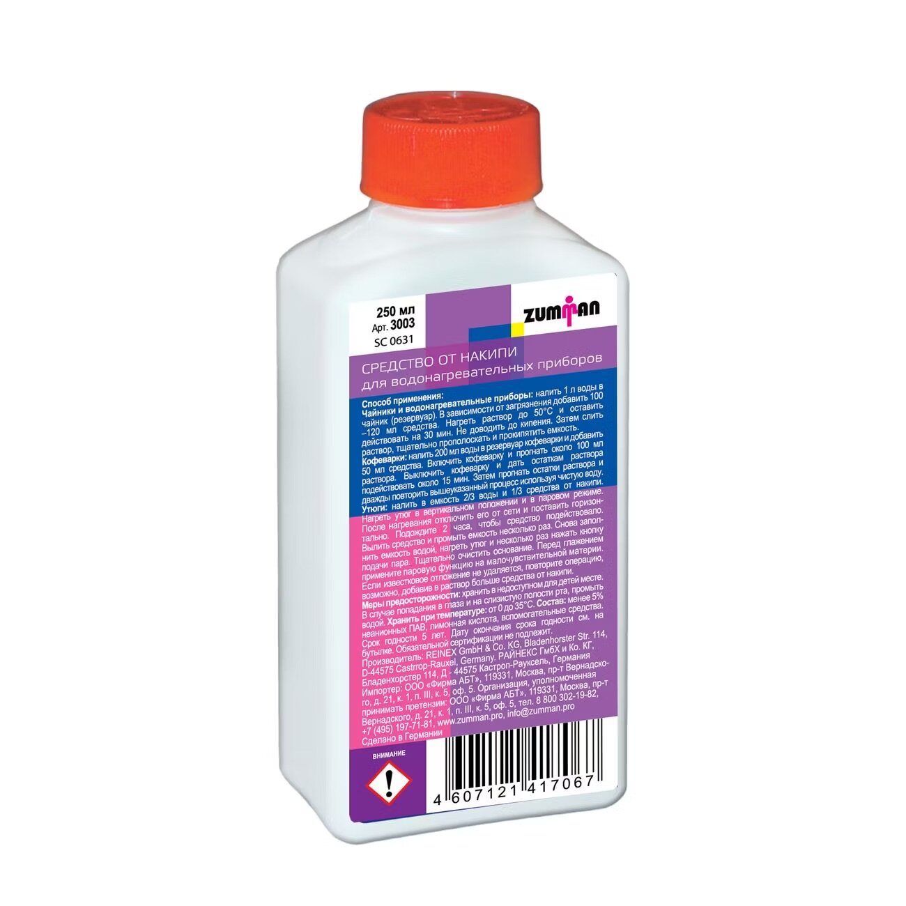 Средство для удаления накипи Zumman 3003, для чайников, утюгов и кофеварок, 250мл информация: