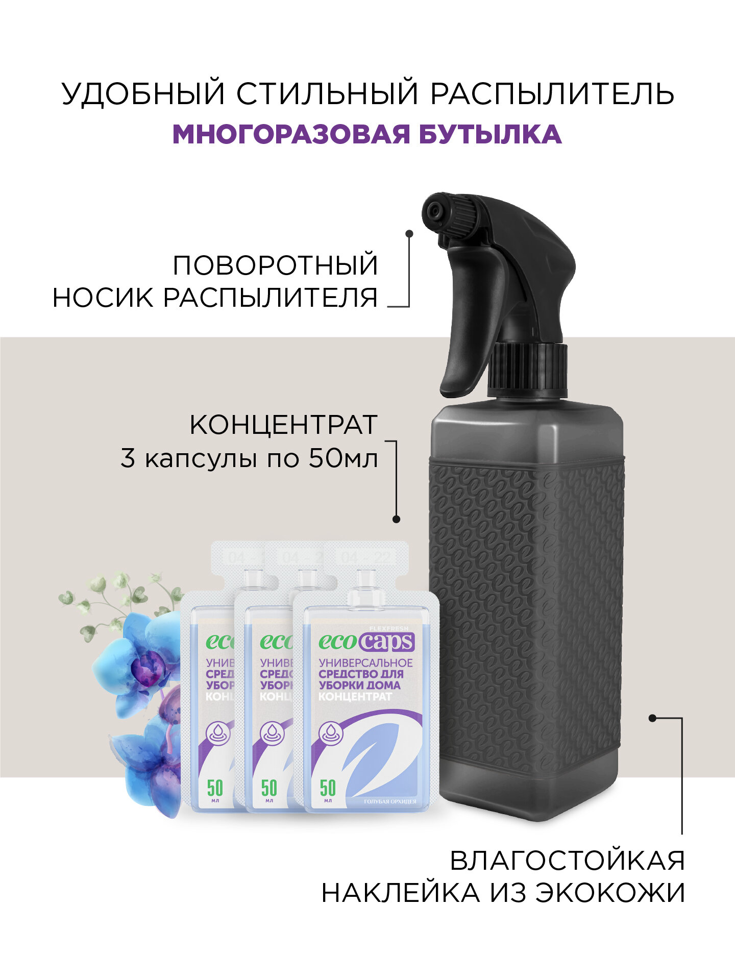 Универсальное средство для уборки дома EcoCaps (концентрат в капсулах) 3 шт + черный флакон 500 мл информация: