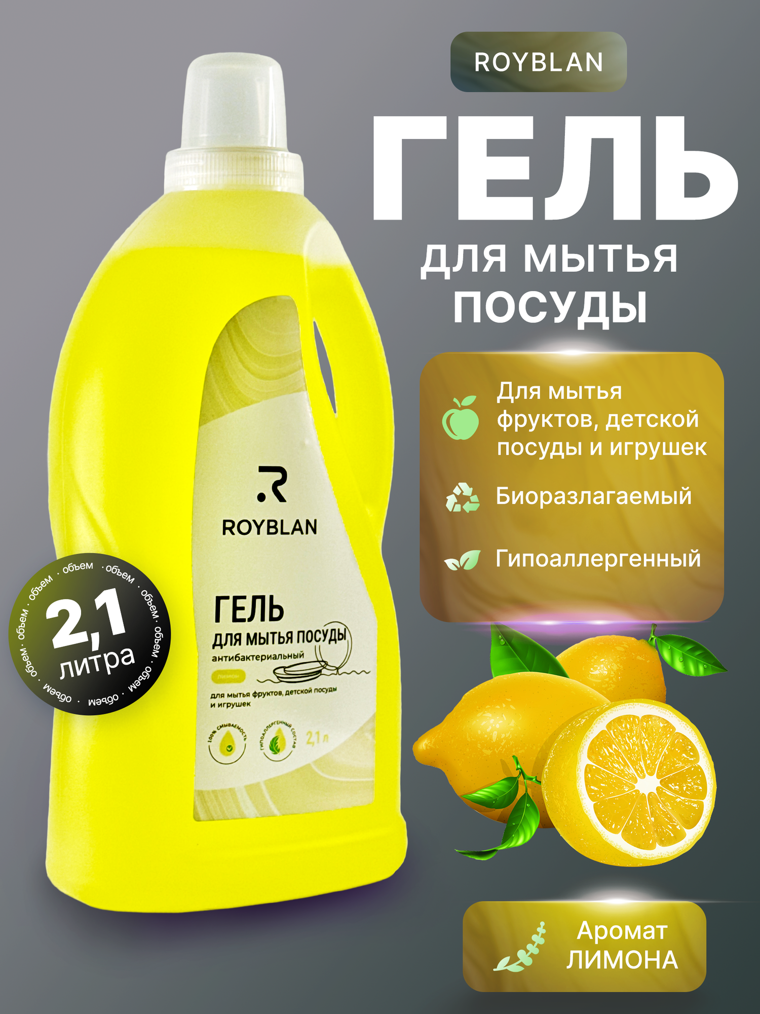 Гель для мытья посуды ROYBLAN, антибактериальный, гипоаллергенный, 2.1 л информация: