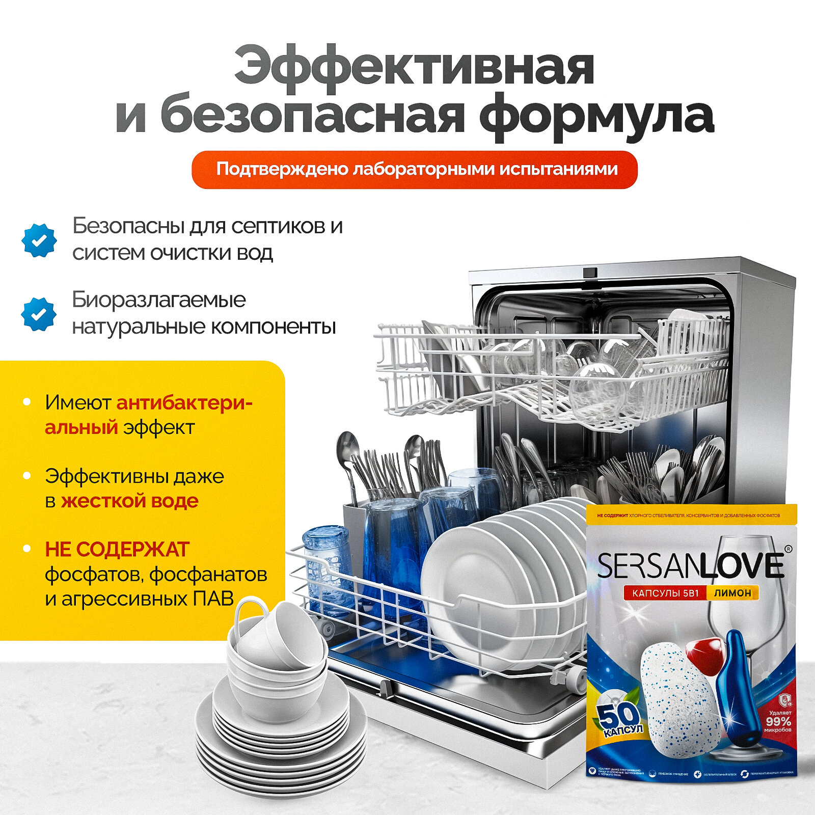 Капсулы для посудомоечной машины SersanLove 5 в 1, таблетки для мытья посуды без фосфатов, 50 штук информация:
