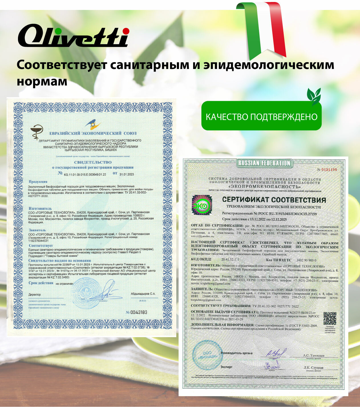 Olivetti Эко-таблетки 3в1 для посудомоечных машин 65 штук / ПРЕМИУМ качество / бесфосфатные, без пятен и разводов информация:
