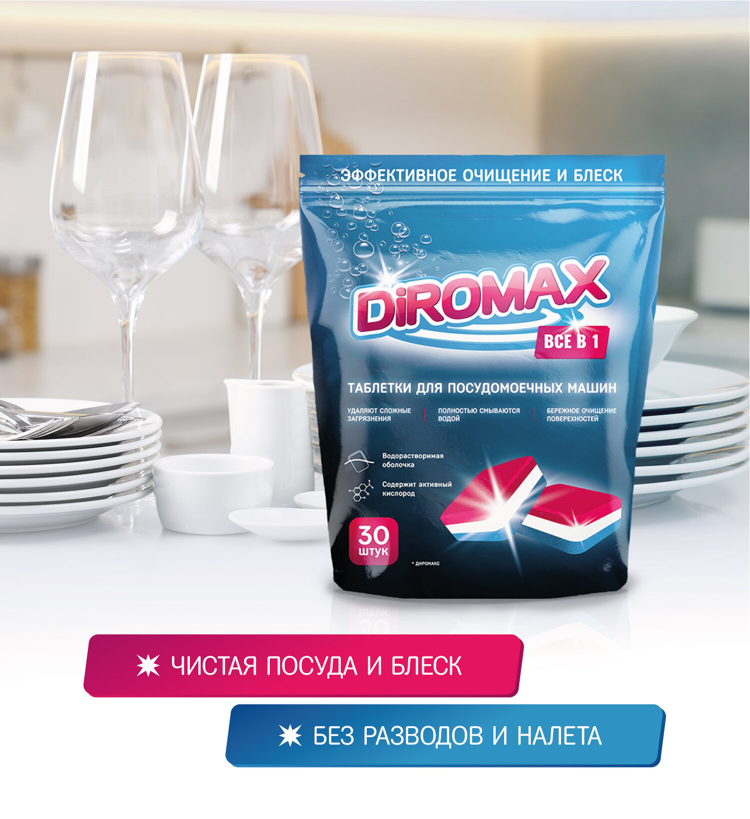 Таблетки для посудомоечной машины DIROMAX "Все в 1", 30 штук, растворимая оболочка, средство для пмм информация:
