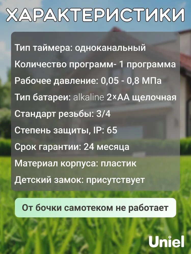 Таймер для полива электронный одноканальный Uniel, автополив уличный для огорода и сада информация: