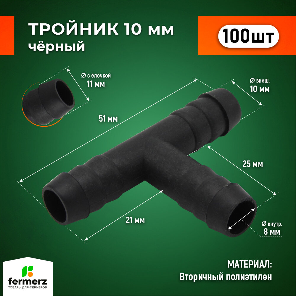 Тройник 10мм пластиковый Т образный - 100шт черный. Фитинг переходник 10 мм для трубки для шланга информация: