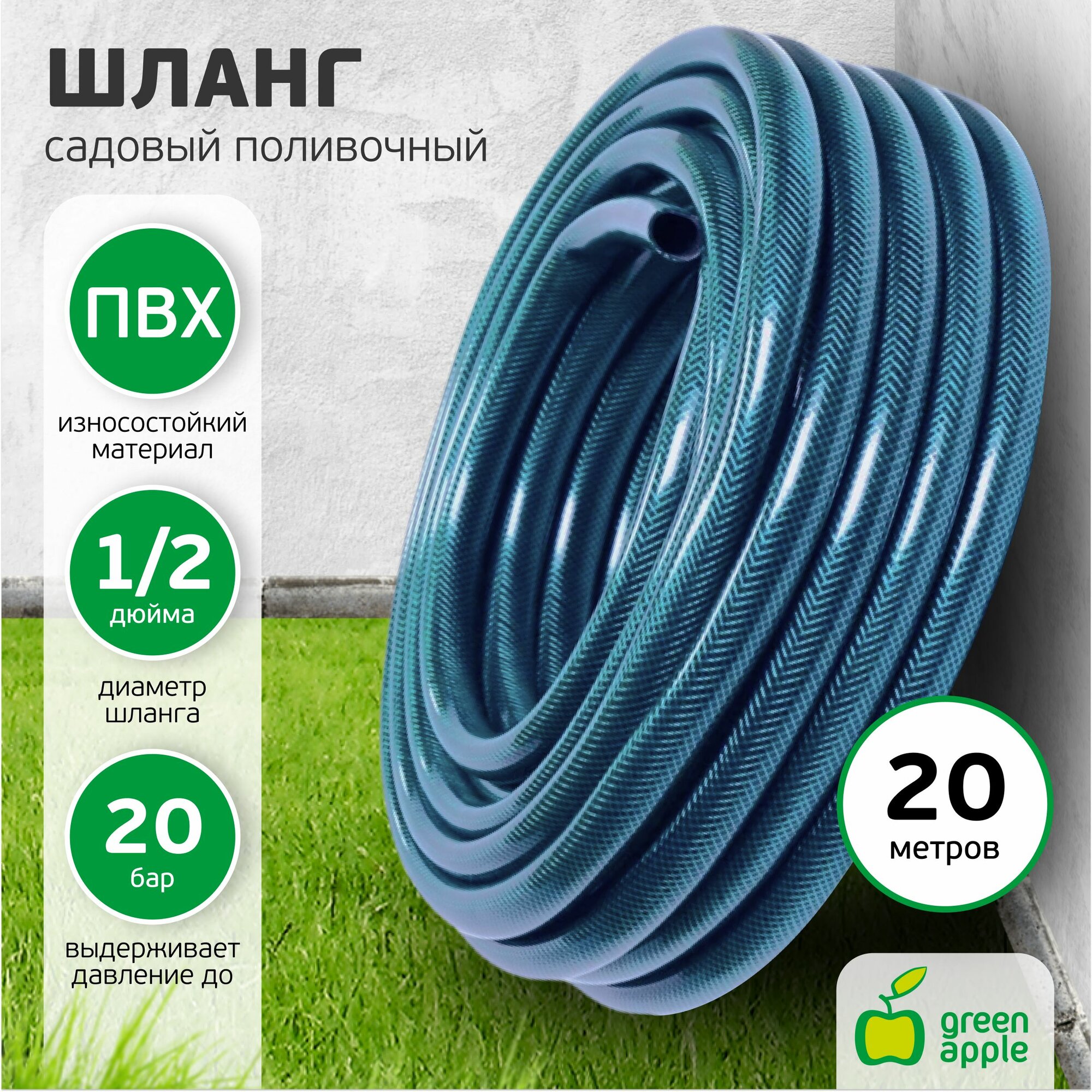 Шланг садовый для полива GREEN APPLE GWGH1-028 / Шланг поливочный 1/2 Стандарт армированный 12мм 20м информация:
