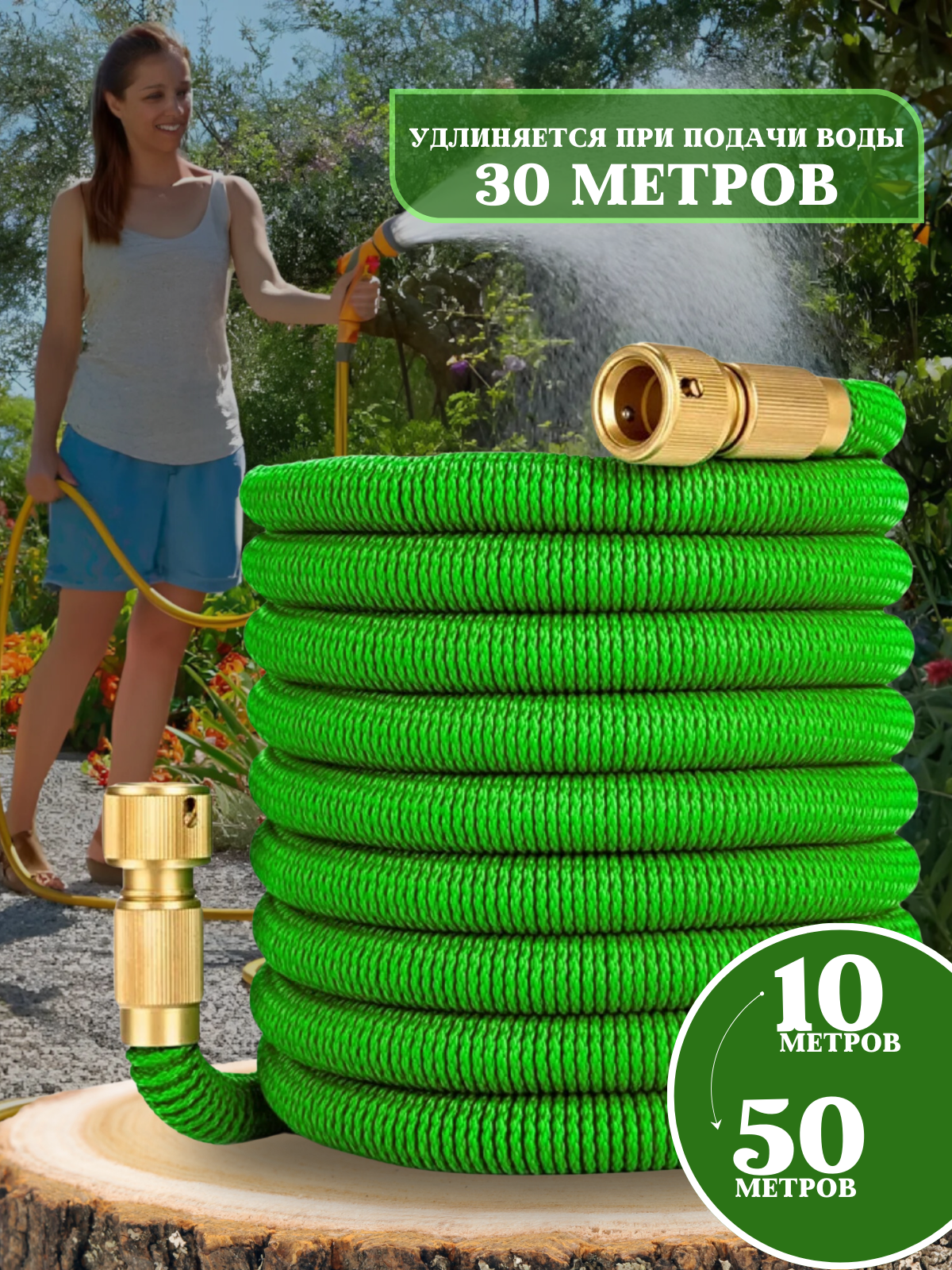 10 цен на Поливочный шланг 50 метров, растягивающийся шланг для полива без быстросъема с насадкой распылителем, для дачи, садовый, удлиняющийся.