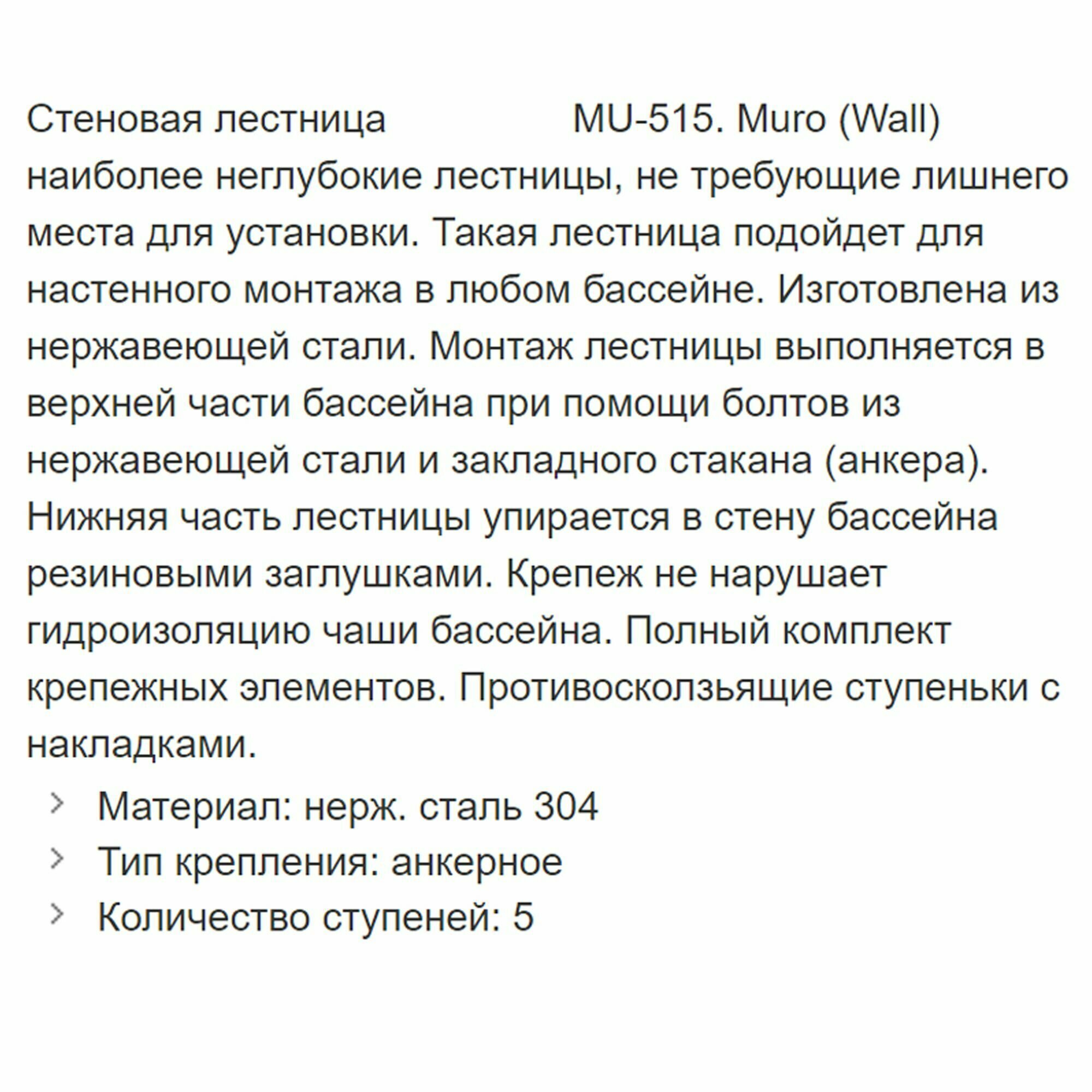 Лестница для бассейна, 5 ступеней, CLASSIC 500 с антислипом - MU-515 M205A, AISI-304 информация: