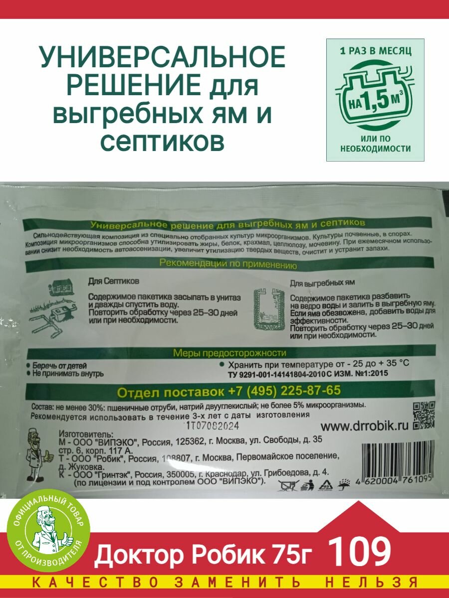Бактерии Доктор Робик 109 для септиков, выгребных ям и дачных туалетов, 3 шт. по 75 г информация: