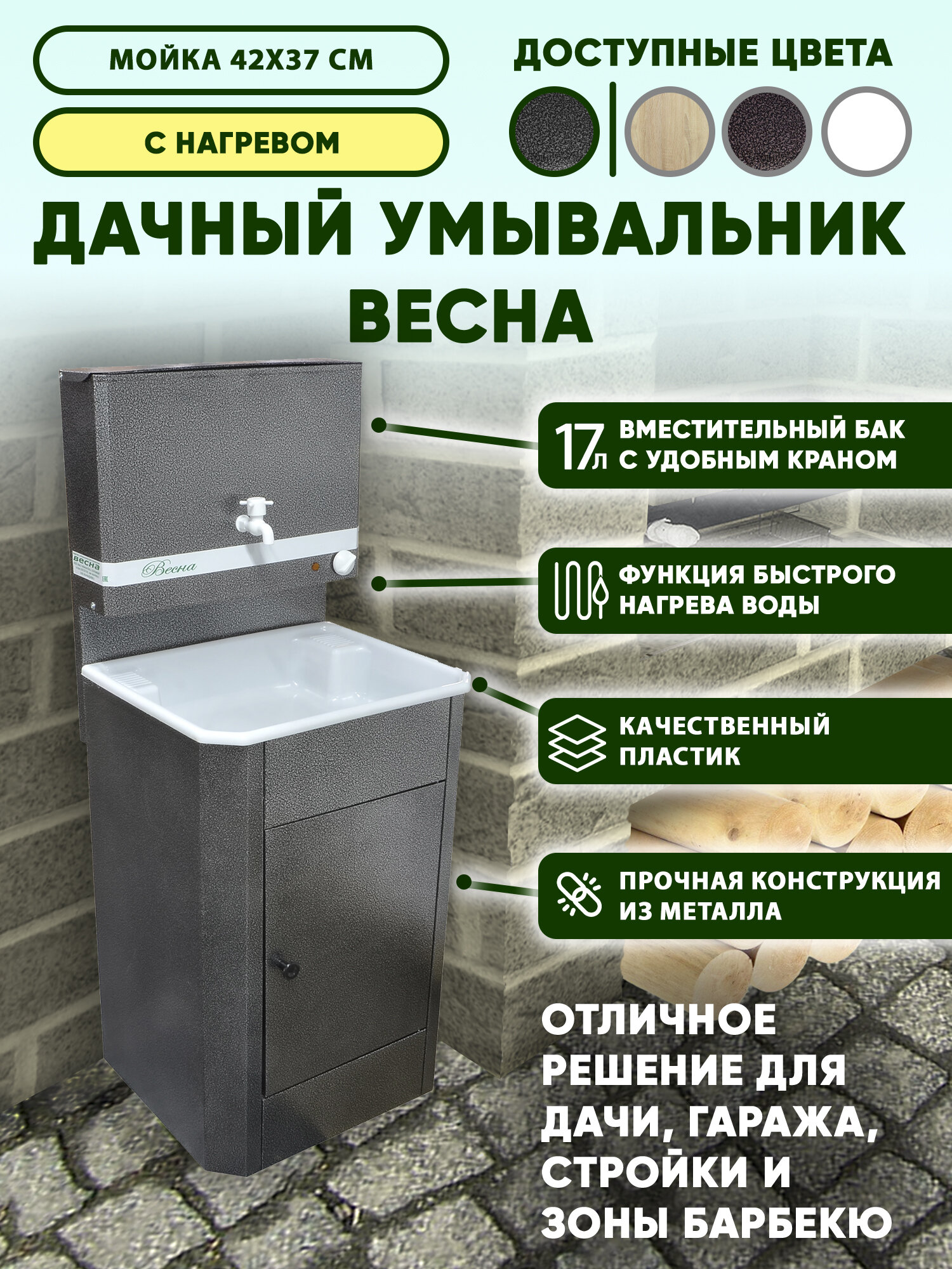 Умывальник дачный "Весна" с подогревом с эвн, тумба, пластмассовая мойка, цвет серебро информация: