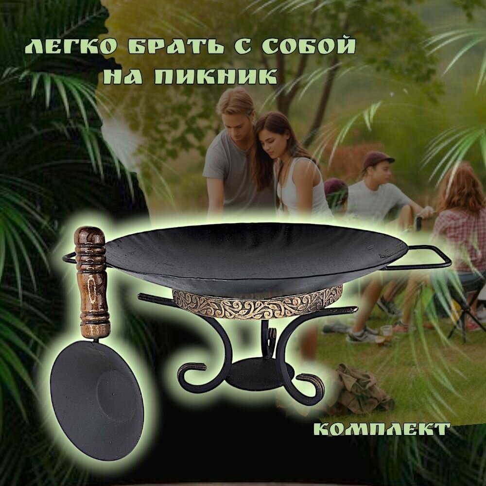 Комплект посуды для пикника и отдыха/садж 35см воронёный+подставка с черпаком/Казаны РФ информация: