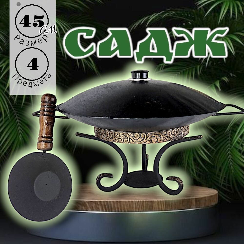 Комплект посуды для пикника и отдыха/садж 45см воронёный+крышка+подставка с черпаком/Казаны РФ информация: