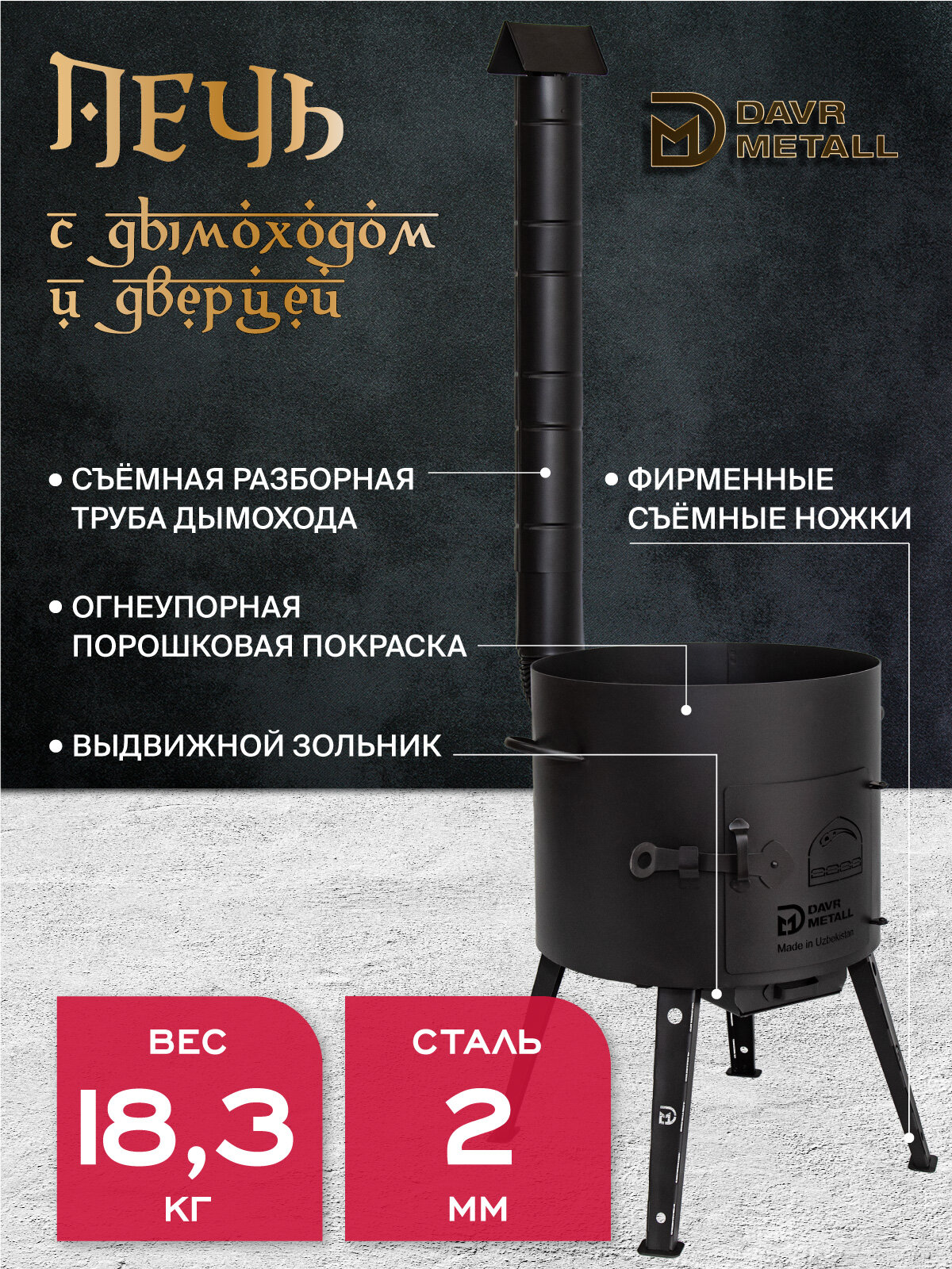 Печь для казана 22 л, диаметр 49 см, сталь 2 мм, с трубой, дверцей, зольником, съемные ножки информация: