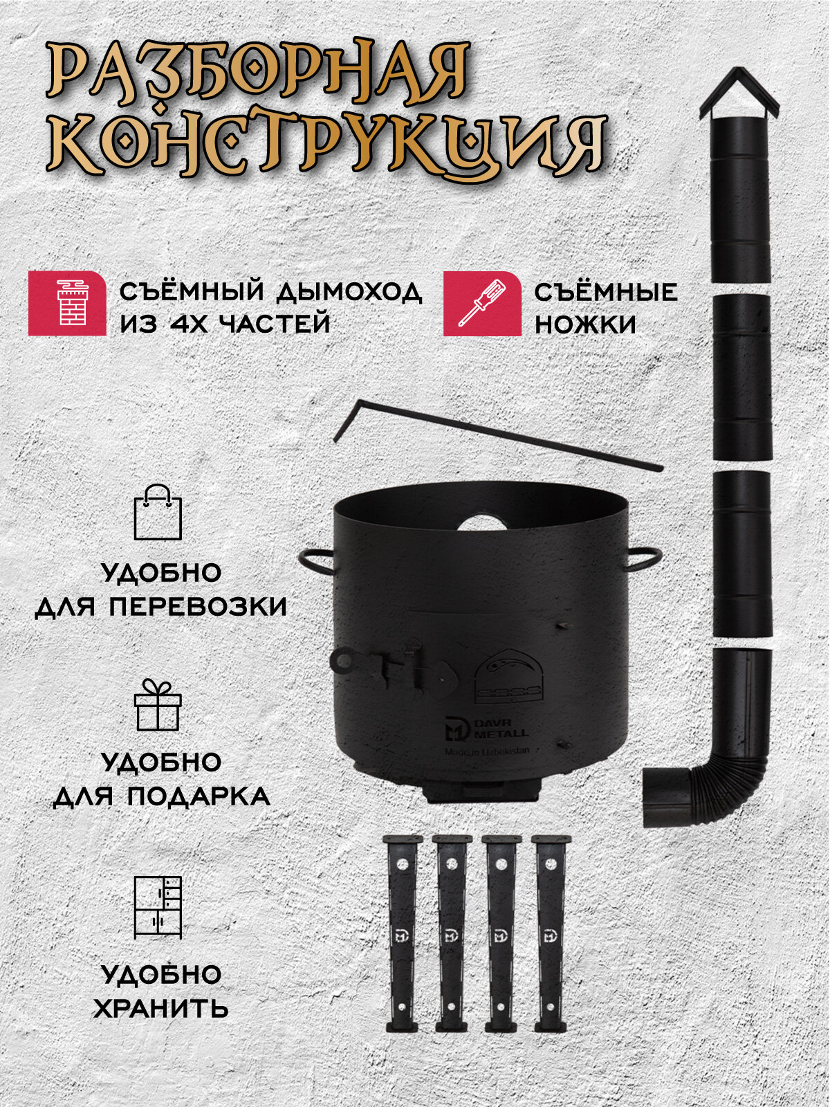 Печь для казана объемом 10 литров с ручками, съемные ножки, зольник