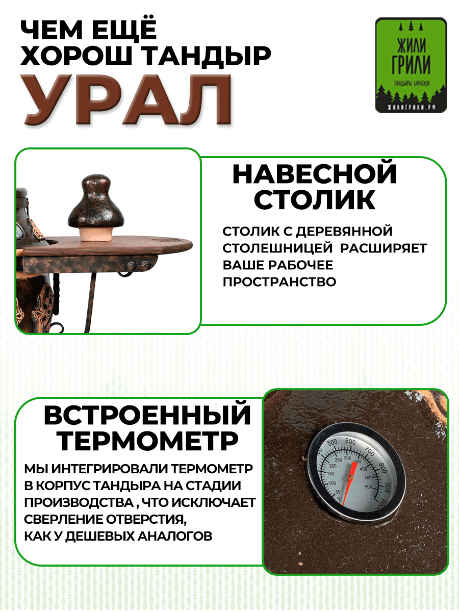 Тандыр с откидной крышкой Урал, столик с деревянной столешницей, на колесах, 50 л, с термометром, цвет черный патина информация: