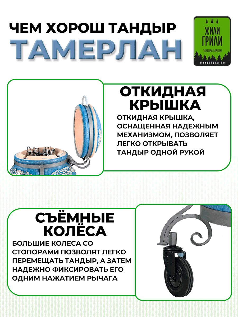 Отзывы на Тандыр с откидной крышкой Тамерлан, навесной столик, съёмные колёса, термометр, 50 л, цвет морская волна патина