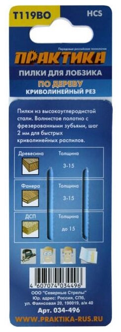 Пилки для лобзика по дереву, ДСП тип T119BO 76х50 мм, криволинейный рез, HCS (2шт.) ПРАКТИКА 034-496 информация: