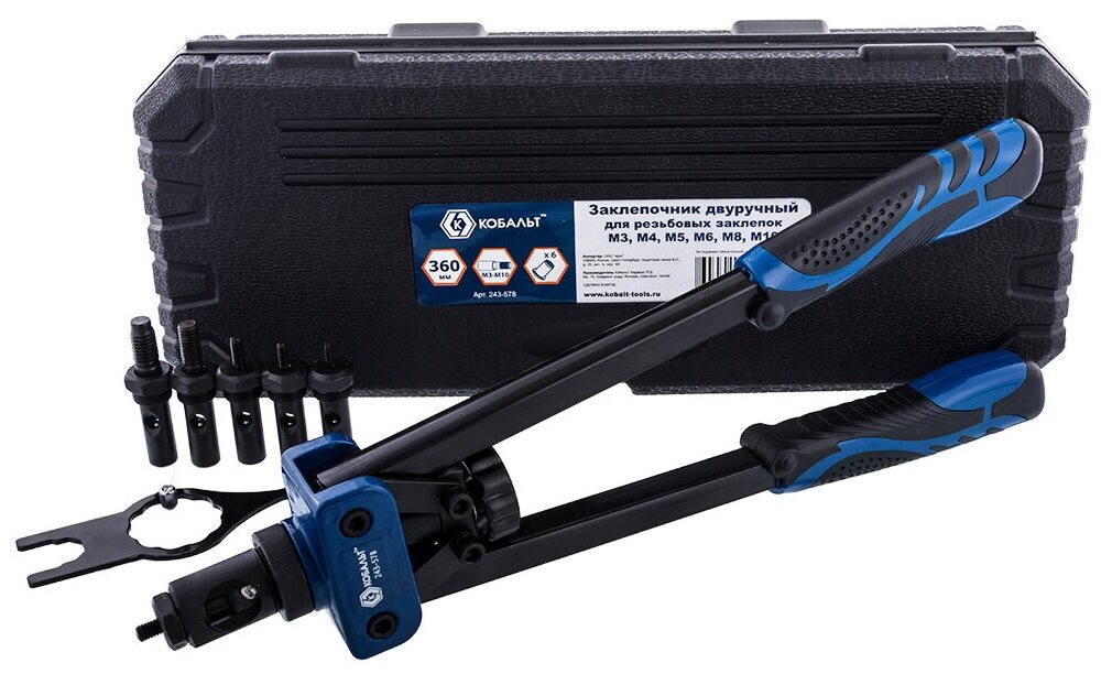 Заклепочник кобальт 360 мм, двуручный, резьбовые заклепки M3, M4, M5, M6, M8, M10, кейс информация: