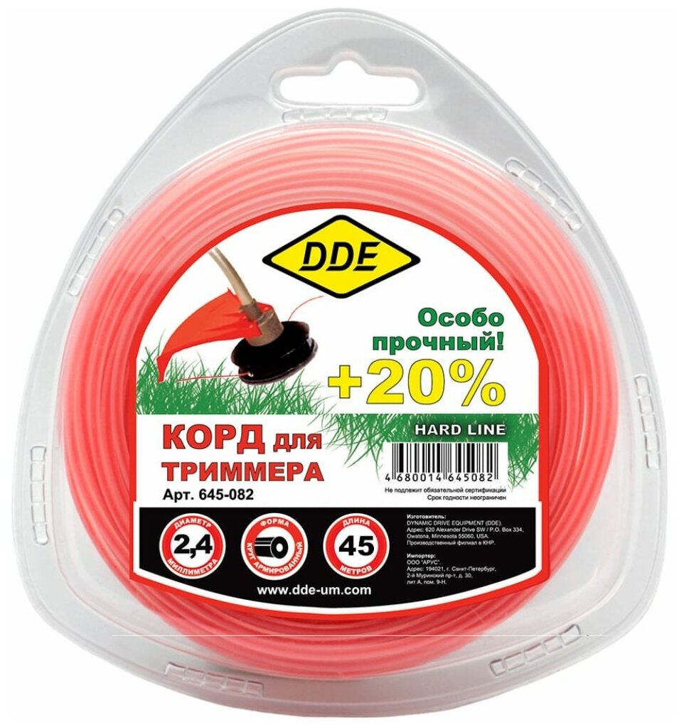 Отзывы на Корд триммерный в блистере DDE "Hard line" (круг армированный) 2,4 мм х 45 м, серый/красный