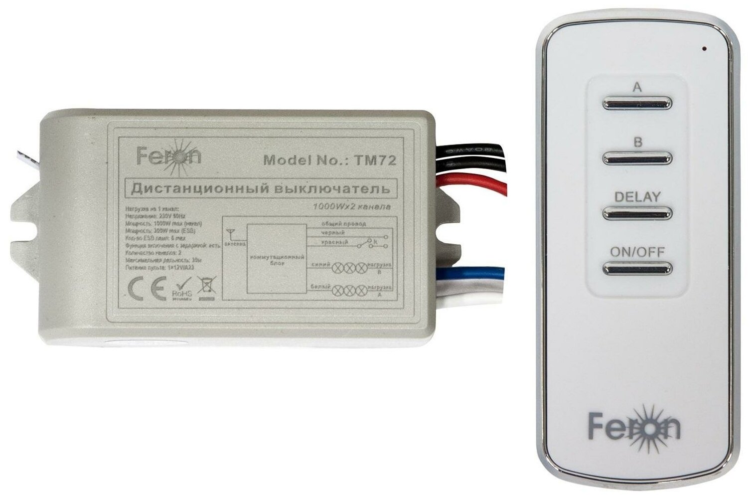 Выключатель дистанционный 230V 1000W 2-хканальный 30м с пультом управления, TM72 информация: