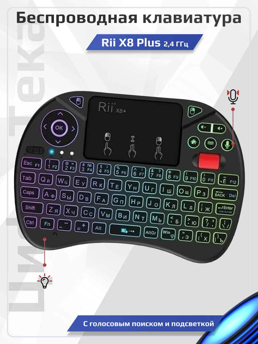 Rii X8 Plus 2,4 ГГц Беспроводная клавиатура с Голосовым поиском подсветкой и аккумулятором Тачпад мышь mini Keyboard Voice Scroll whell информация: