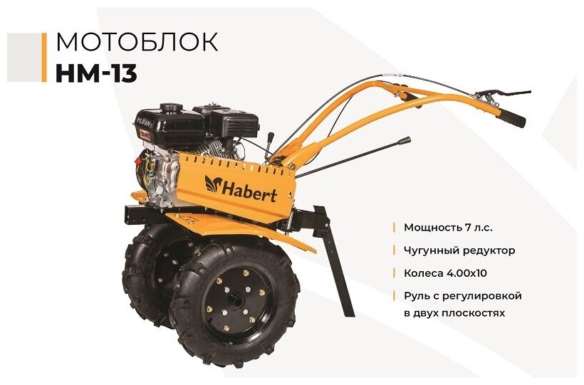 Отзывы на Мотоблок бензиновый Habert HM-13 7лс колёса 4.00*10 2 вперед 1 назад шестеренчато-цепной редуктор