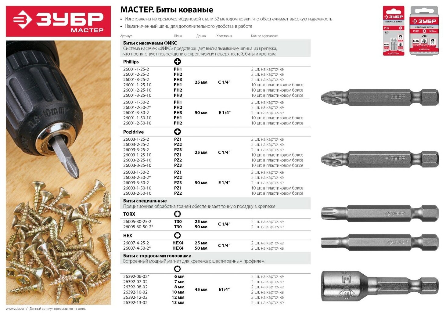 Биты Зубр "мастер" с торцовой головкой, магнитные,26392-10-02 .