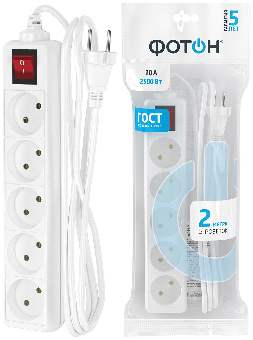 Удлинитель сетевой для розетки фотон 10А 2м 5 розеток с выключателем белый, ГОСТ 501 ₽